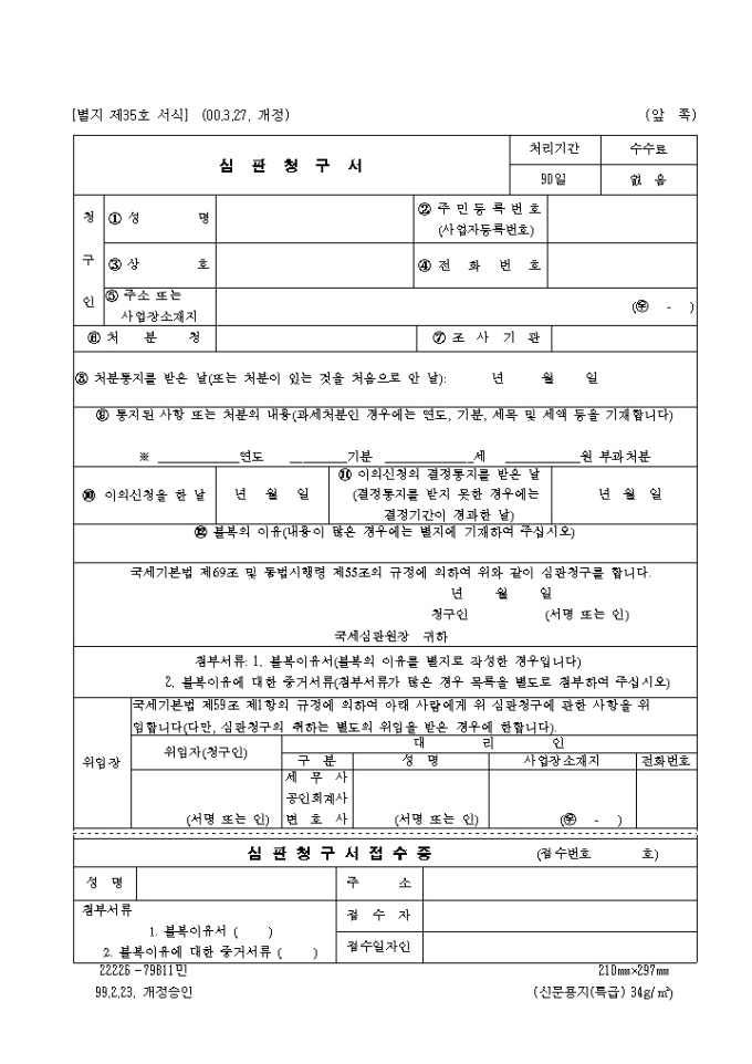 국세기본법 제69조 및 동법시행령 제55조의 규정에 의하여 심판청구를 할때 사용하는