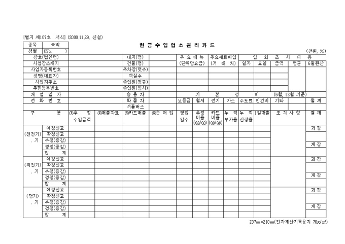 제105호 현금 수입 업소 관리카드 양식입니다. 추정 수입금액, 매출과표, 카드매출, 순매입, 영업일수, 추정비율, 카드비율, 누적 부가율, 누적 신장율, 1일매출, 조치사항 등을 기재합니다.
