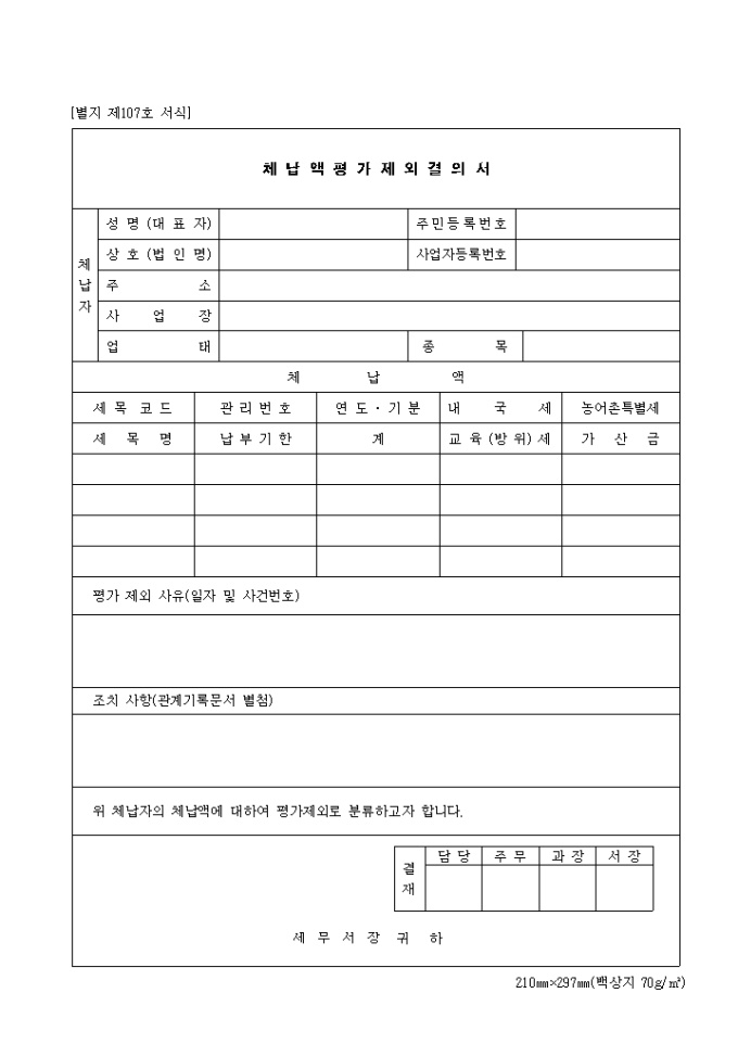 9,000원/월제107호 체납액 평가 제외 결의서 양식입니다. 체납자의 인적사항, 체납액, 평가 제외 사유, 조치사항 등을 기재합니다.