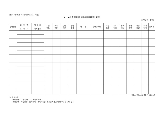 9,000원/월제108호 ( )년 감면법인 사후 관리 대상자 명부(2000.12.11. 개정) 양식입니다. 일련번호, 법인명, 소재지, 대표자, 등록번호, 사업연도, 세목구분, 감면구분, 관련법률,내용, 금액, 요건검토, 사후관리, 통보대상, 부당감면, 적립증감, 최저한세, 농특세 등을 기재합니다.