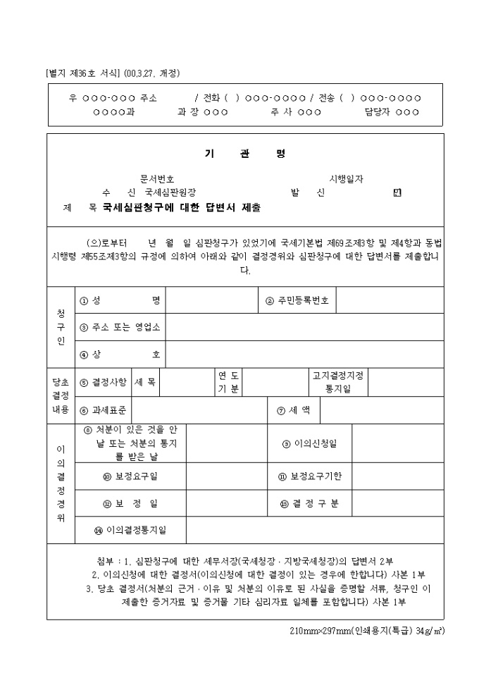국세심판청구에 대한 답변서제출(제36호)(2000.3.27. 개정)