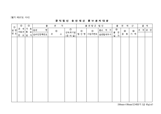 9,000원/월과세자료전번호, 자료통보일자, 출연자, 출연받은 법인, 출연재산 등을 기록하여 관리하는 제108호 공익법인출연재산통보관리대장 양식입니다.