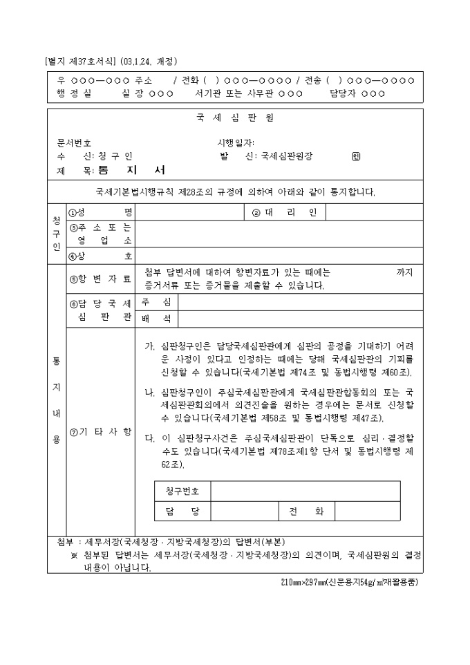 국세기본법시행규칙 제28조의 규정에 의한 심판청구를 할때 사용하는 제37호 통지서 입니다.(2003.1.24. 개정)