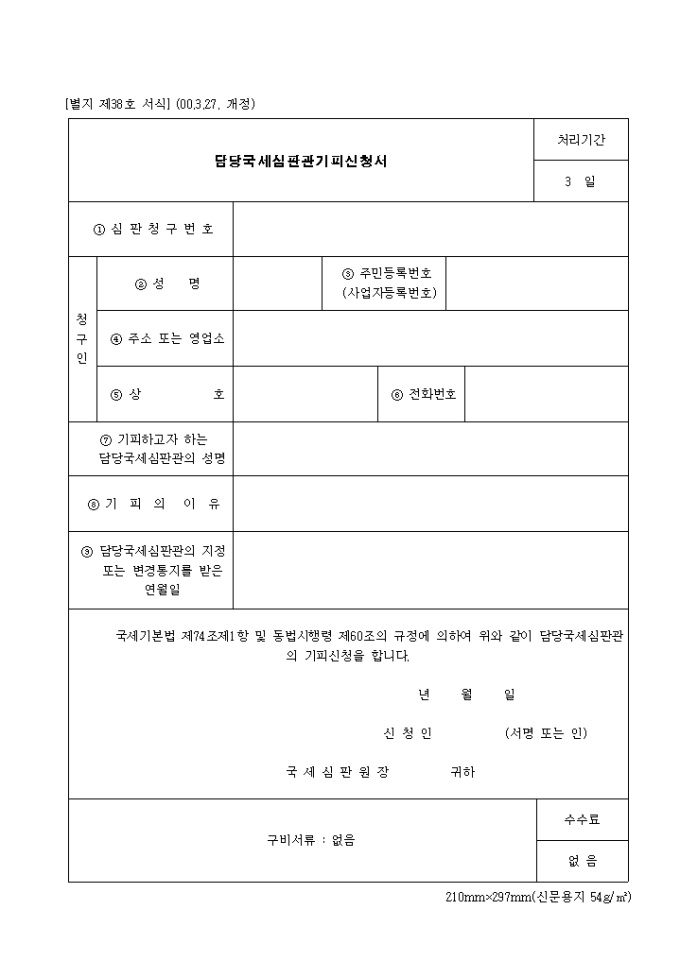 9,000원/월국세기본법 제74조제1항 및 동법시행령 제60조의 규정에 의하여 위와 같이 담당국세심판관의 기피신청할때 사용하는 제38호 담당국세심판관기피신청서입니다. (2000.3.27. 개정)