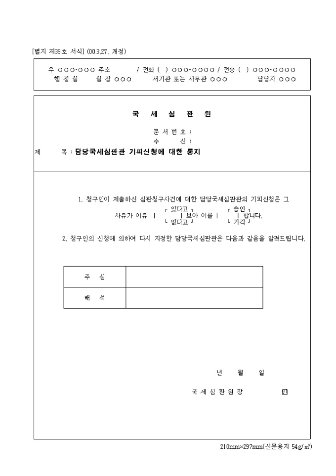 9,000원/월청구인이 제출한 심판청구사건에 대한 담당국세심판관의 기피신청에 대한 결정을 통보하는 제39호 담당국세심판관기피신청서에대한통지 입니다. (2000.3.27. 개정)