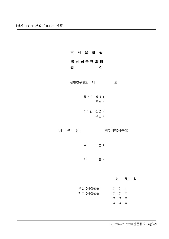 9,000원/월청구인,대리인 인적사항,처분청,주문,이유를 기록하는 제41호 국세심판원국세심판관회의결정 입니다.(2000.3.27. 신설)