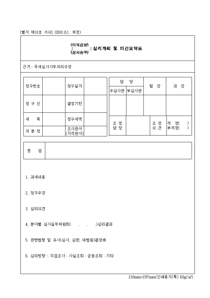 제10호 (이의신청)심사청구심리계획 및 의견요약표 (2001.8.1. 개정) 양식입니다.