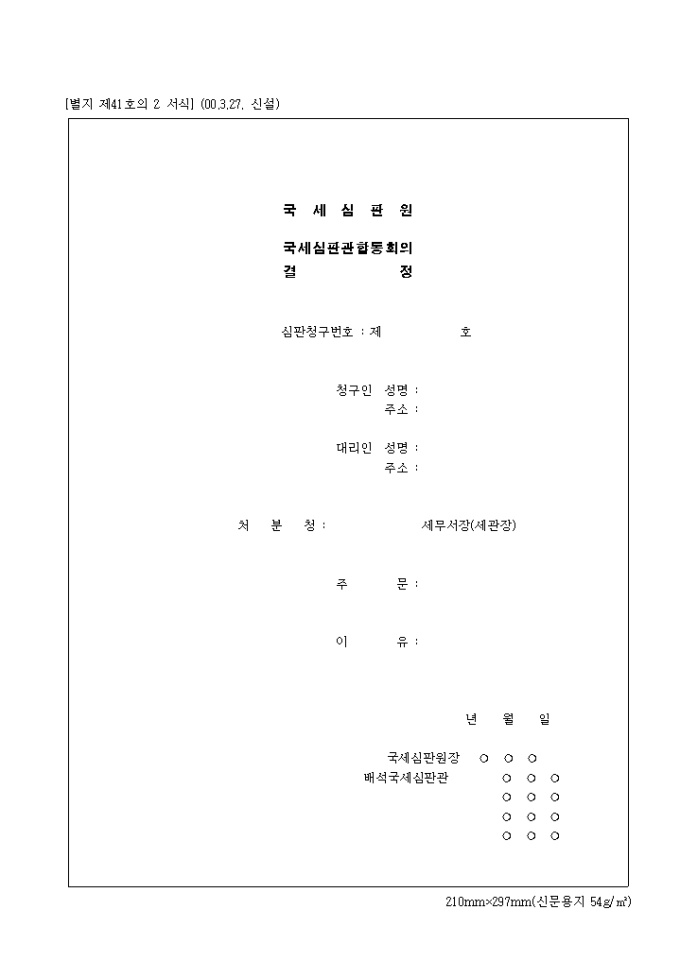 9,000원/월청구인,대리인 인적사항,처분청,주문,이유를 기재하는 제41호의2 국세심판원국세심판관합동회의결정 입니다.(2000.3.27. 신설)
