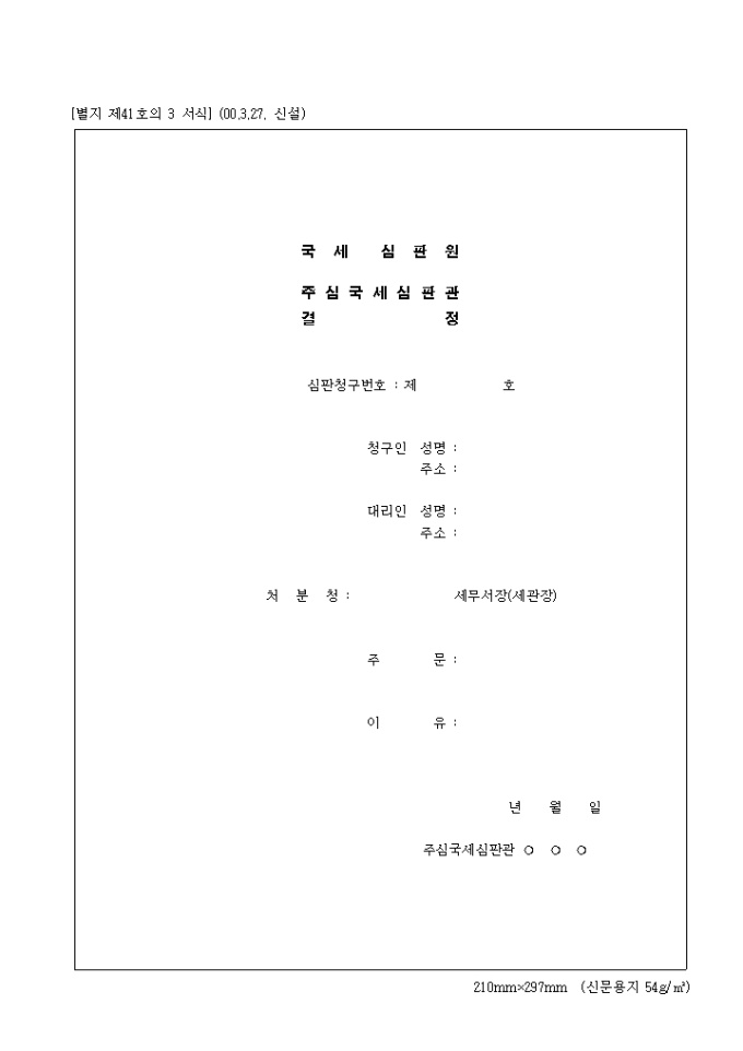 9,000원/월청구인과 대리인의 인적사항,처분청,주문,이유를 기록하는 제41호의3 국세심판원주심국세심판관결정 입니다.(2000.3.27. 신설)