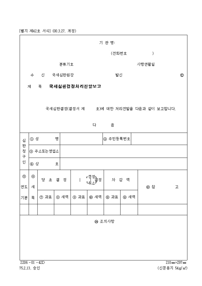 심판청구인 인적사항,연도기분,세목,당초결정.갱정(취소)결정.차감액의 과표,세액을 기록하는 제42호 국세심판결정처리전말보고입니다.(2000.3.27. 개정)