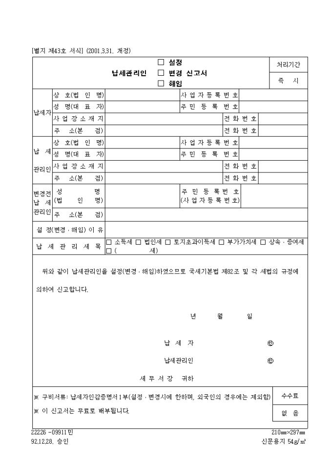 국세기본법 제82조 및 각 세법의 규정에 의하여 납세관리인을 설정(변경,해임)신고할때 사용하는 제43호 납세관리인설정(변경.해임)신고서입니다. (2001.3.31. 개정)