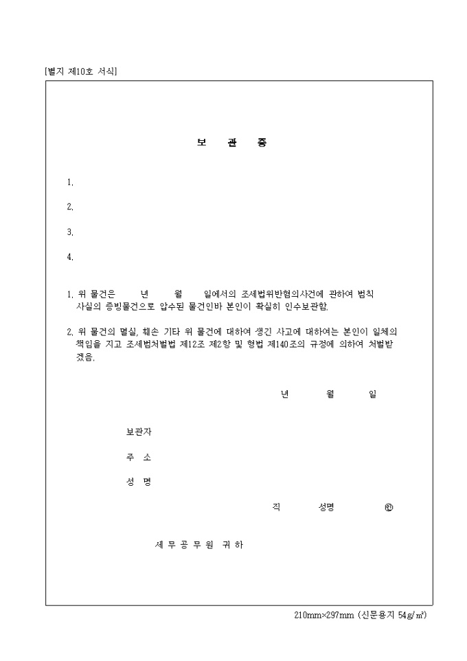 9,000원/월제10호 보관증 1. 위 물건은 년 월 일에서의 조세법위반혐의사건에 관하여 범칙 사실의 증빙물건으로 압수된 물건인바 본인이 확실히 인수보관함. 2. 위 물건의 멸실, 훼손 기타 위 물건에 대하여 생긴 사고에 대하여는 본인이 일체의 책임을 지고 조세범처벌법 제12조 제2항 및 형법 제140조의 규정에 의하여 처벌받 겠음.
