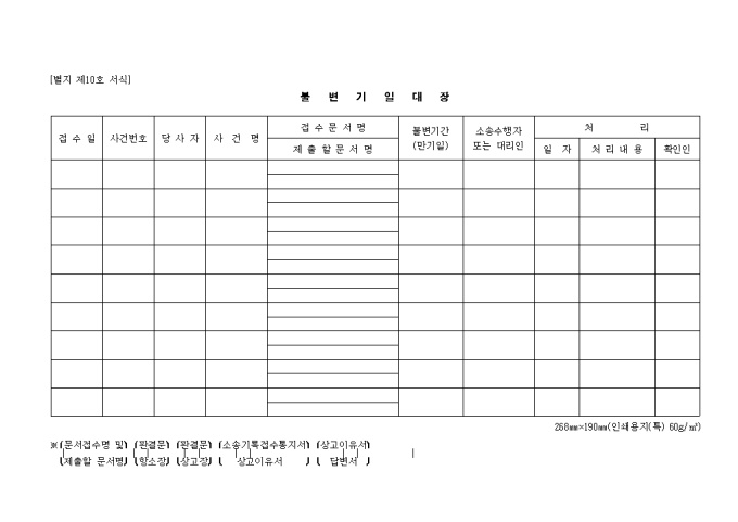 접수일, 사건번호, 당사자, 사건명, 접수문서명, 제출할문서명, 불변기간, 소송수행자, 처리 등을 기록하여 관리하는 제10호 불변기일대장 양식입니다.