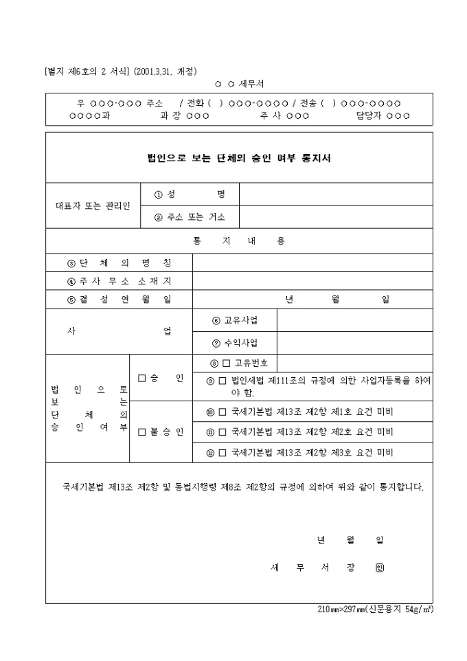 9,000원/월국세기본법 제13조 제2항 및 동법시행령 제8조 제2항의 규정에 의하여 법인으로 보는 단체의 승인 여부 통지할때 사용하는 제6호의2 법인으로보는단체의승인여부통지서입니다. (2001.3.31. 개정)