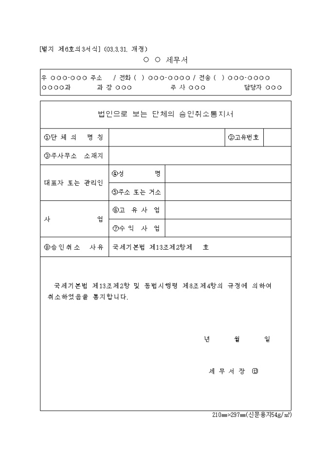 9,000원/월국세기본법 제13조제2항 및 동법시행령 제8조제4항의 규정에 의하여 법인으로 보는 단체의 승인취소하였음을 통지하는 제6호의3 법인으로보는단체의승인취소통지서입니다.(2003.3.31. 개정)