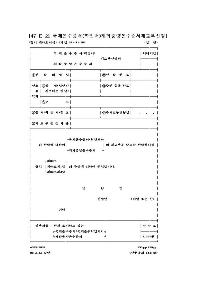 위 선박에 대하여 (국제톤수증서(확인서), 재화중량톤수증서)의 재교부를 받고자 선박법시행규칙 (제63조, 제65조제1항제, 66조제3항)의 규정에 의하여 신청하고자 할 때 사용하는 '(국제톤수 증서(확인서), 재화 중량톤수 증서) 재교부신청서' 양식입니다.
