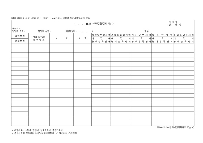 9,000원/월차갑납부할세액, 내국세, 농어촌특별세, 분납등을할세액, 자진납부세액, 납부한세액, 무과소납부세액 등을 기록하는 제110호 ( 납기)사후결정결의서(Ⅱ) (2000.12.11. 개정) 양식입니다.