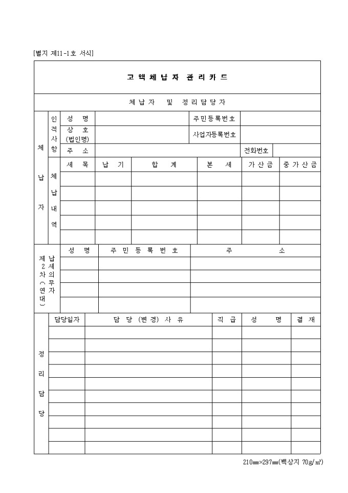 제11-1호 고액 체납자 관리카드 양식입니다. 체납자의 인적사항 및 체납내역, 제2차 납세의무자, 정리 담당 등을 기재합니다.
