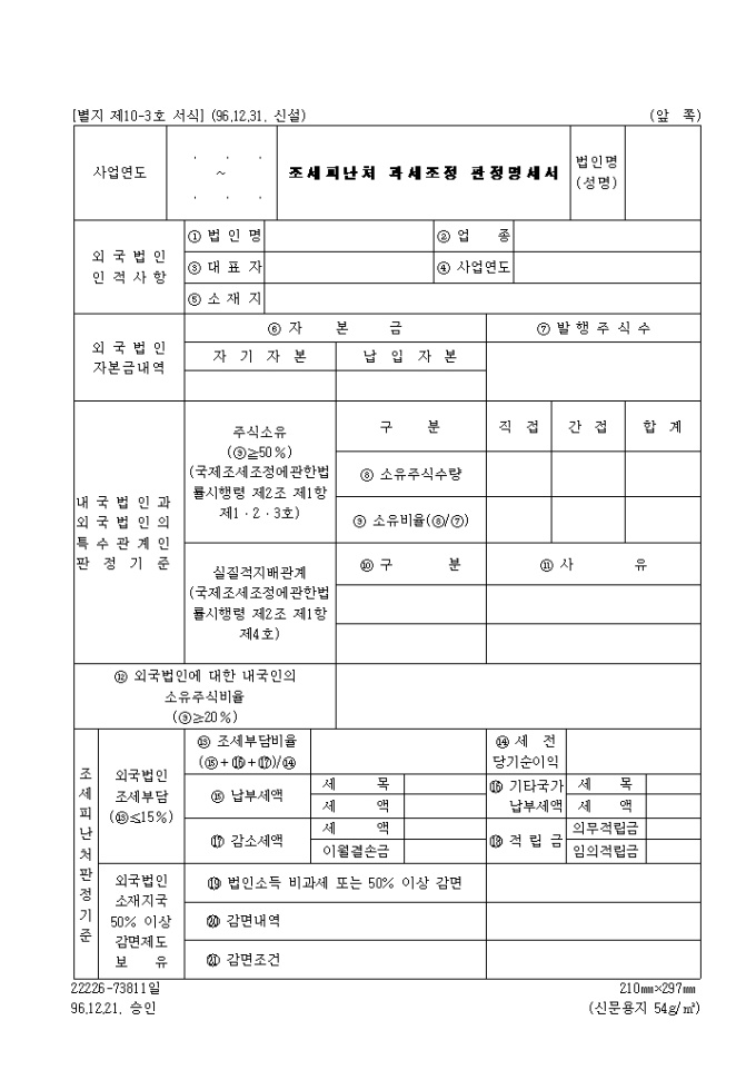제10.3호 조세피난처과세조정판정명세서(1996.12.31. 신설)