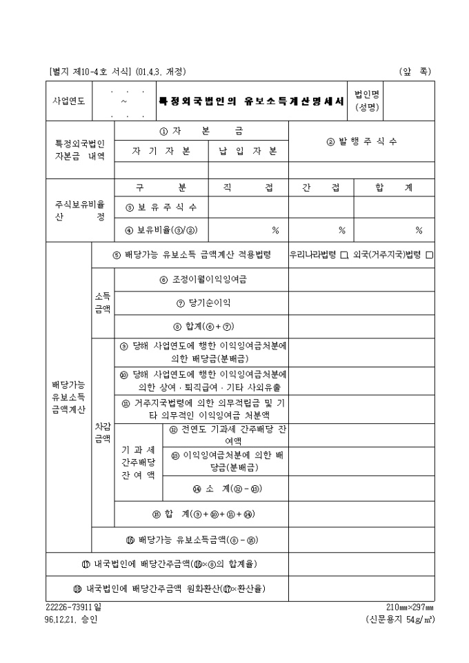 특정외국법인의유보소득계산명세서(제10.4호)(2001.4.3. 개정)