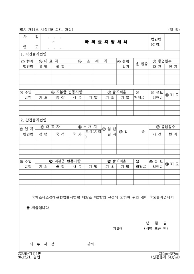 9,000원/월국제조세조정에관한법률시행령 제37조 제2항의 규정에 의한 제11호 국외출자명세서입니다.(1996.12.31. 개정)