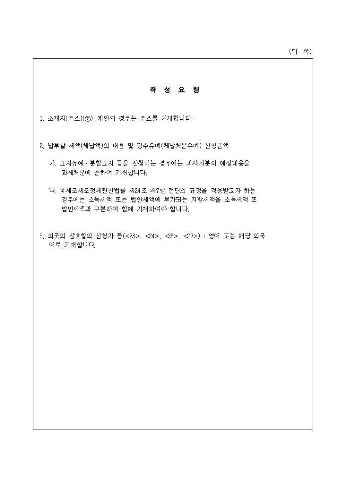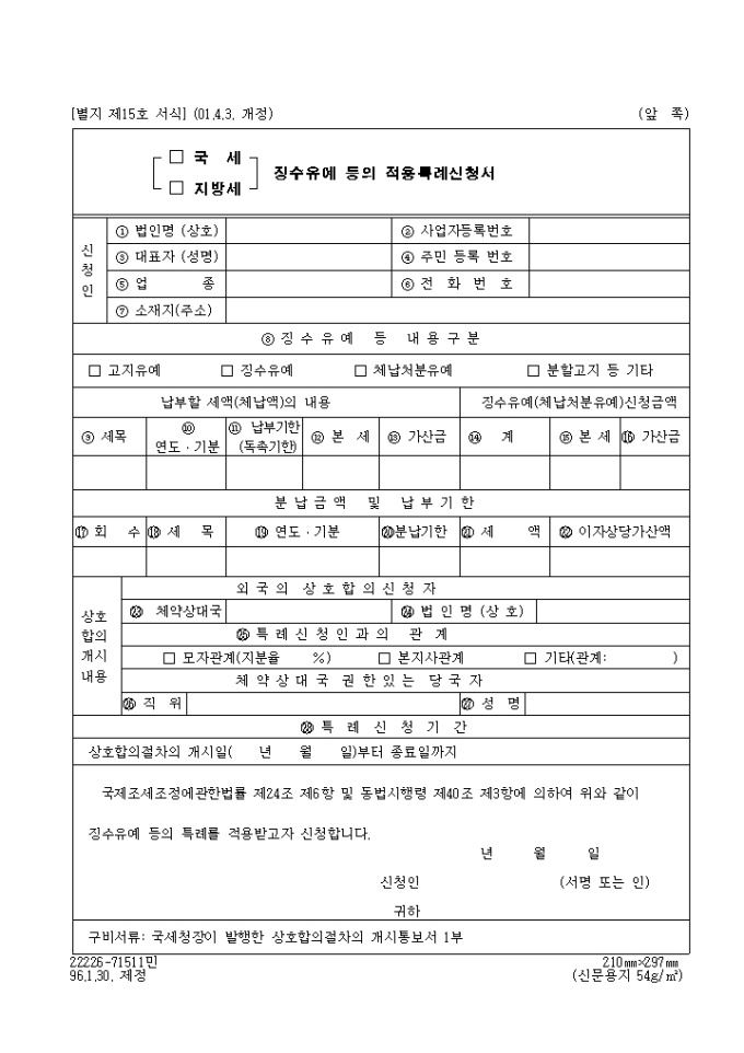 9,000원/월국제조세조정에관한법률 제24조 제6항 및 동법시행령 제40조 제3항에 의한 제15호 국세.지방세징수유예등의적용특례신청서입니다. (2001.4.3. 개정)