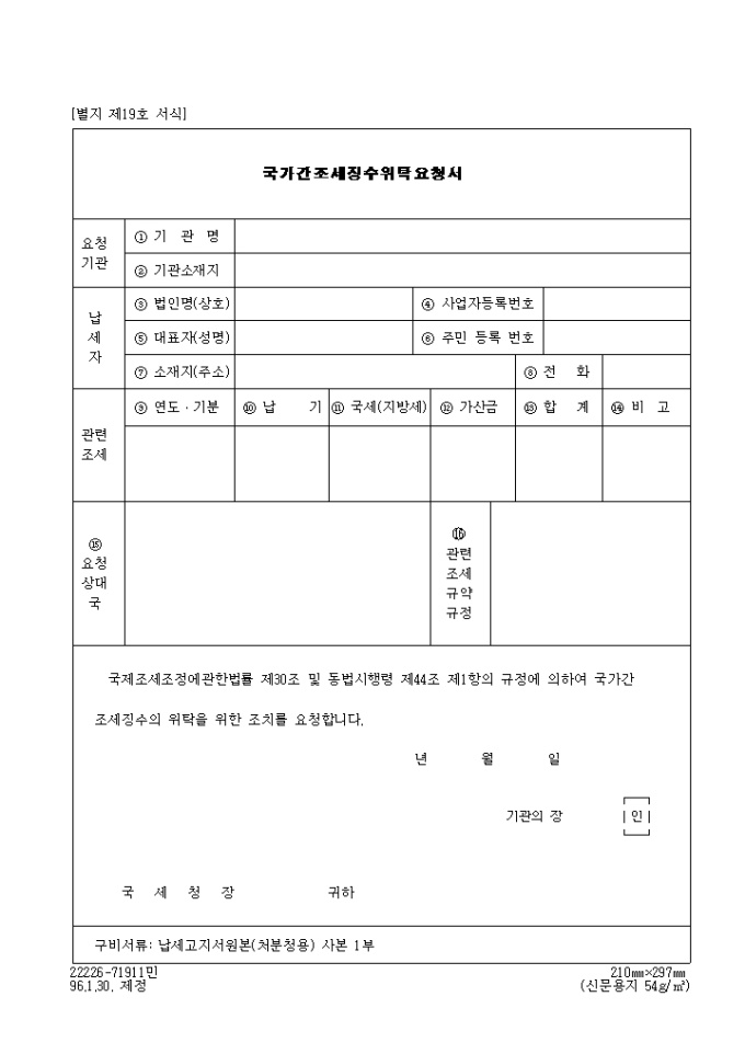 9,000원/월국제조세조정에 관한 법률 제30조 및 동법시행령 제44조 제1항의 규정에 의한 제19호 국가간조세징수위탁요청서입니다.