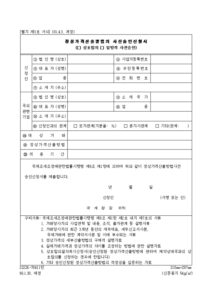 정상가격산출방법의사전승인신청서(제3호)(2001.4.3. 개정)