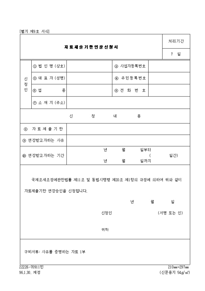 9,000원/월국제조세조정에 관한 법률 제11조 및 동법시행령 제20조 제1항의 규정에 의한 제9호 자료제출기한연장신청서입니다.