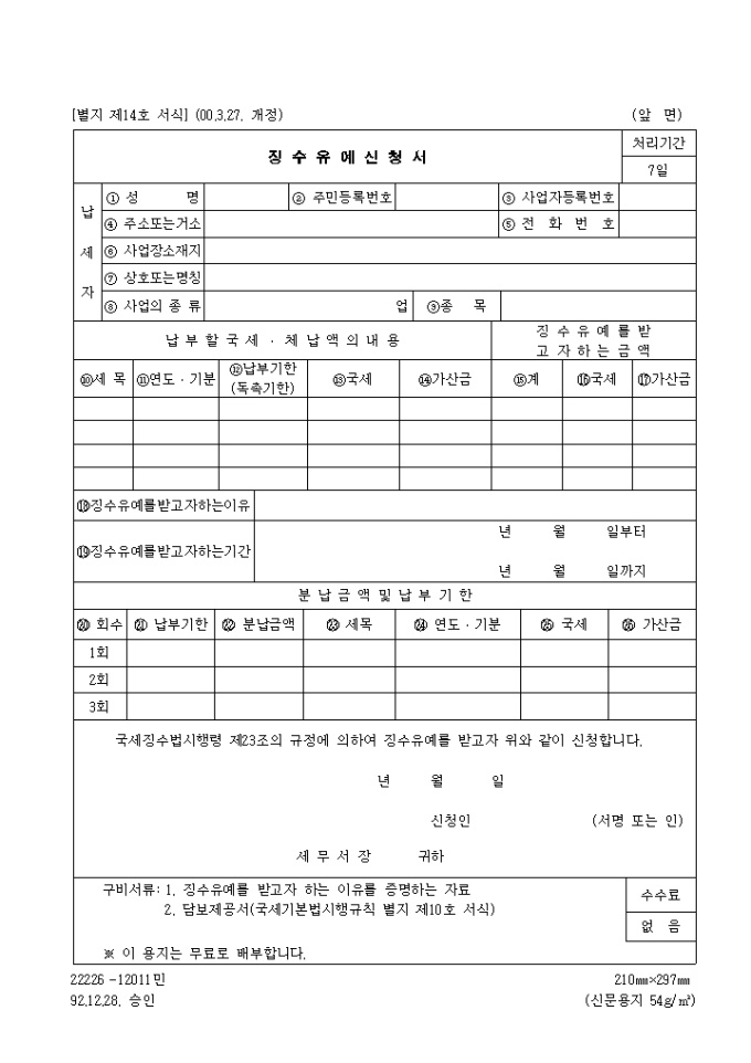 징수유예신청서(제14호)(2000.3.27. 개정)