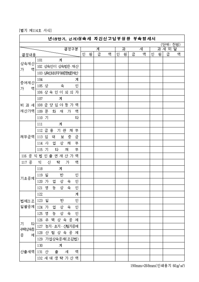 9,000원/월상속재산가액, 증여재산가액, 비과세재산가액, 채무금액 등을 기록하여 관리하는 제114호 상속세 자진 신고 납부상황 부속명세서 양식입니다.