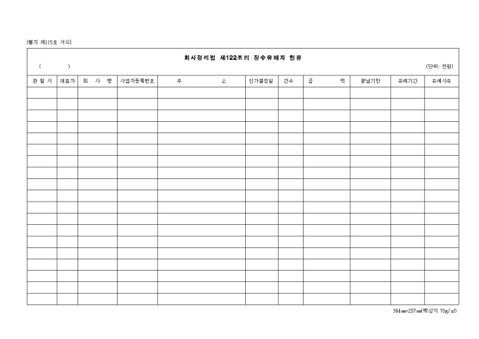 9,000원/월제115호 회사정리법 제122조의 징수 유예자 현황 양식입니다. 관할서, 대표자, 회사명, 사업자 등록번호, 주소, 인가결정일, 건수, 금액, 분납기한, 유예기간, 유예사유 등을 기재합니다.