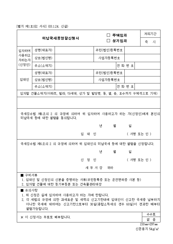 미납국세등열람신청서(주택임차.상가임차)(제1호의2)(2003.1.24. 신설)