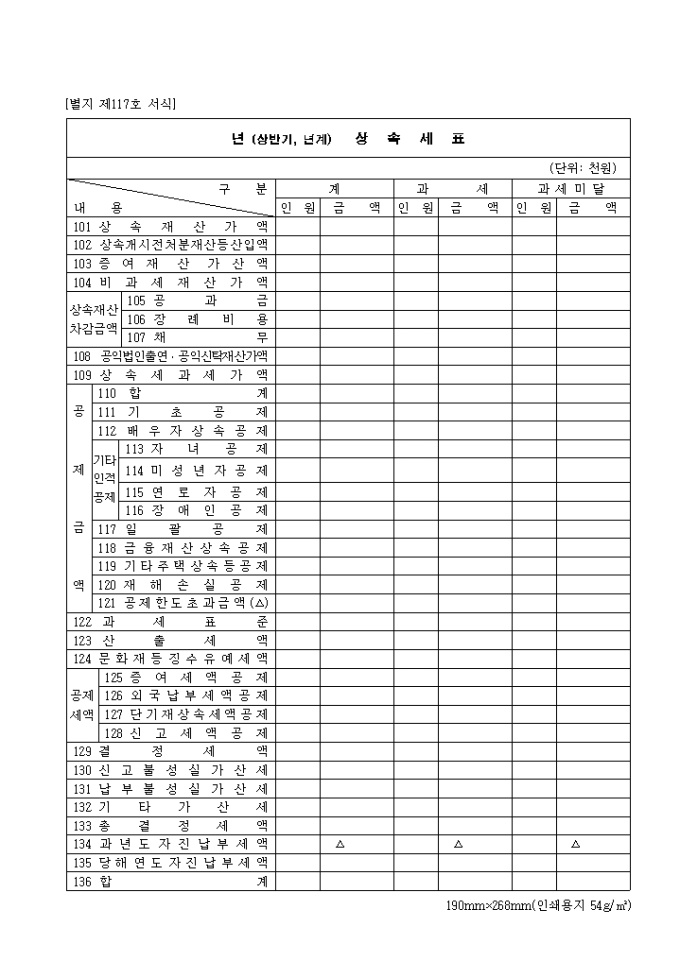 상속재산가액 상속개시전처분재산등산입액 증여재산가산액 비과세재산가액 등의 항목을 기입하여 작성하는 상속세표 양식입니다.