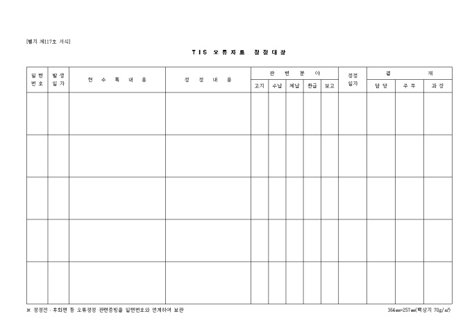 9,000원/월일련번호, 발생일자, 현수록내용, 정정내용, 관련분야, 정정일자 등을 기록하여 관리하는 제117호 TIS오류자료정정대장 양식입니다.