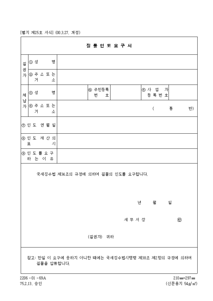 9,000원/월국세징수법 제34조의 규정에 의하여 질물의 인도를 요구할때 사용하는 제25호 질물인도요구서입니다. (2000.3.27. 개정)