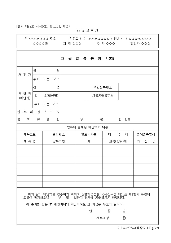 제29호(갑)채권압류통지서(01.3.31. 개정)