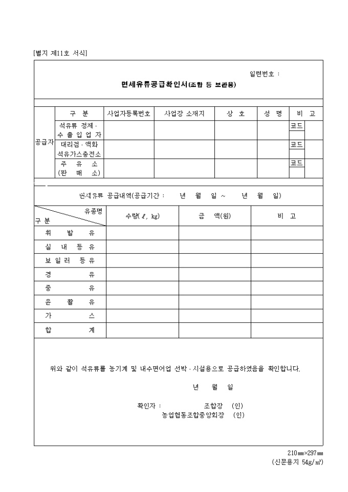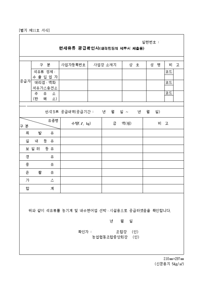 9,000원/월제11호 면세유류공급확인서(조합등보관용) 위와 같이 석유류를 농기계 및 내수면어업 선박·시설용으로 공급하였음을 확인합니다. 년 월 일 확인자 : 조합장 (인) 농업협동조합중앙회장 (인)