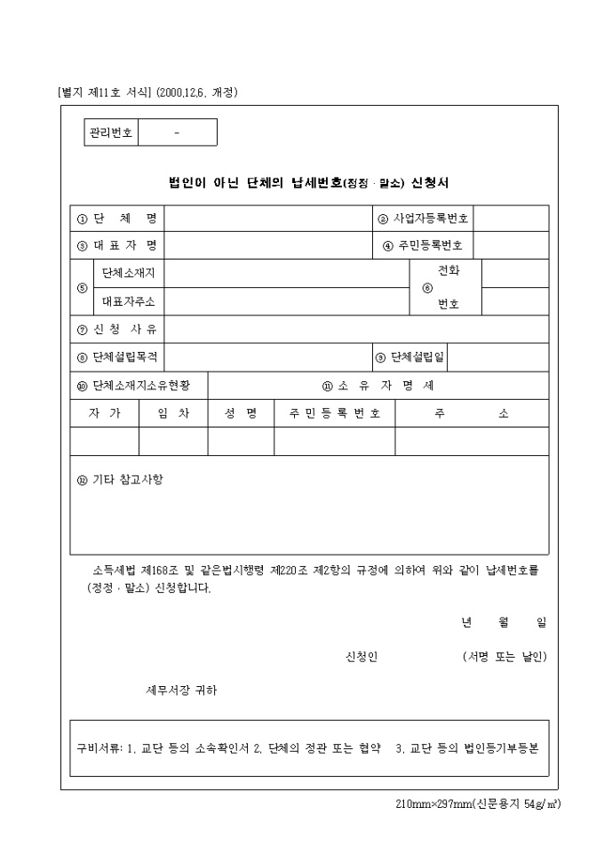 9,000원/월제11호 법인이 아닌 단체의 납세번호(정정 말소)신청서 (2000.12.6. 개정) 양식입니다. 단체명, 사업자 등록번호, 대표자명, 주민등록번호, 전화번호, 신청 사유, 단체 설립목적, 단체 설립일, 단체 소재지 소유현황, 소유자명세, 기타 참고 사항 등을 기재합니다.