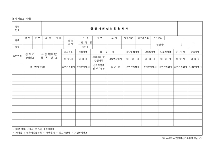 9,000원/월제11호 원천세당연경정 결의서 양식입니다. 일련번호, 신고서 관리번호, 사업자 등록번호, 과세표준, 산출세액, 내국세, 분납등할세액, 납부할세액 등을 기재합니다.