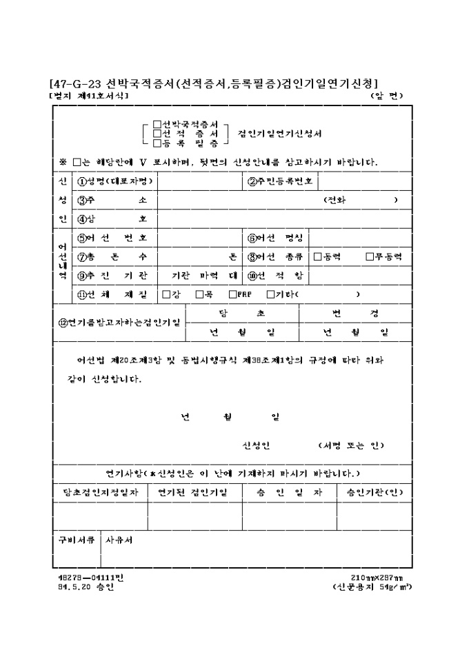 9,000원/월어선법 제20조제3항 및 동법시행규칙 제38조제1항의 규정에 따라 위와 같이 신청하고자 할 때 사용하는 "(선박 국적증서, 선적증서, 등록필증)검인기일 연기신청서" 양식입니다.