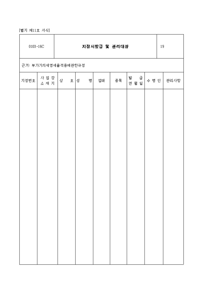 9,000원/월제11호 지정서발급및관리대장 양식입니다. 지정번호, 사업장 소재지, 상호, 성명, 업태, 종목, 발급 연월일, 수명인, 관리 사항 등을 기재합니다.