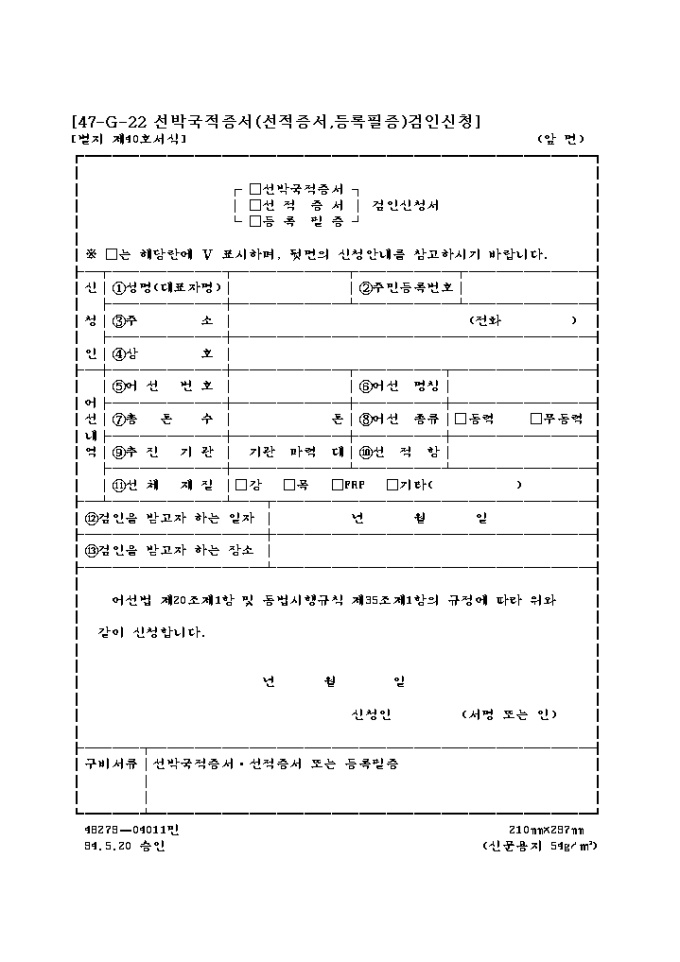 9,000원/월어선법 제20조제1항 및 동법시행규칙 제35조제1항의 규정에 따라 위와 같이 신청하고자 할 때 사용하는 "(선박 국적증서, 선적증서, 등록필증) 검인신청서" 양식입니다.