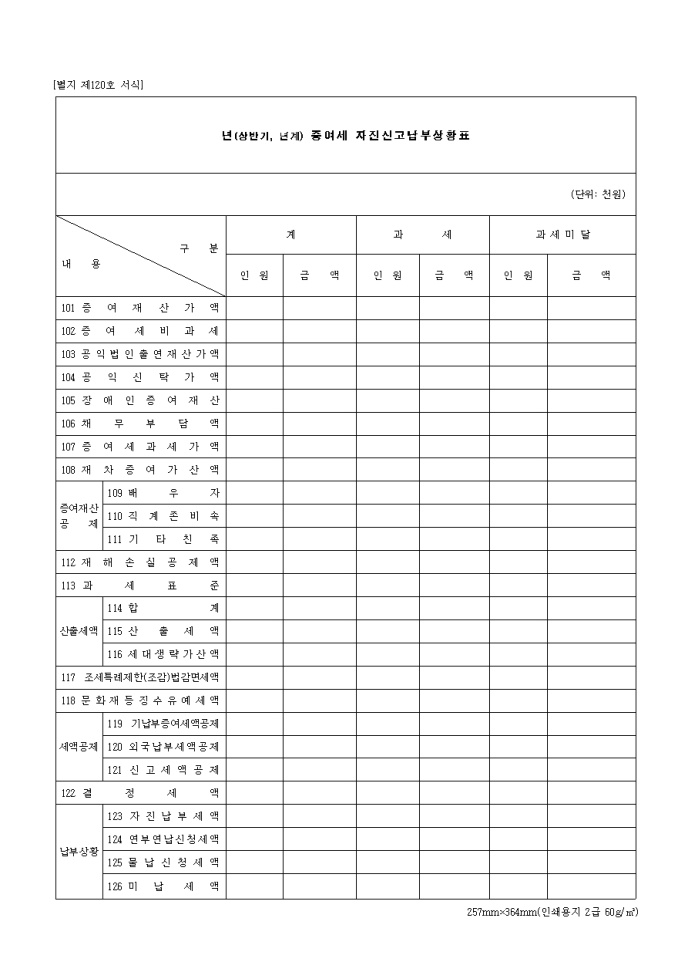 9,000원/월내용별 과세 및 과세미달의 인원 및 금액을 기록하는 제121호 증여세 자진신고납부상황표 양식입니다.