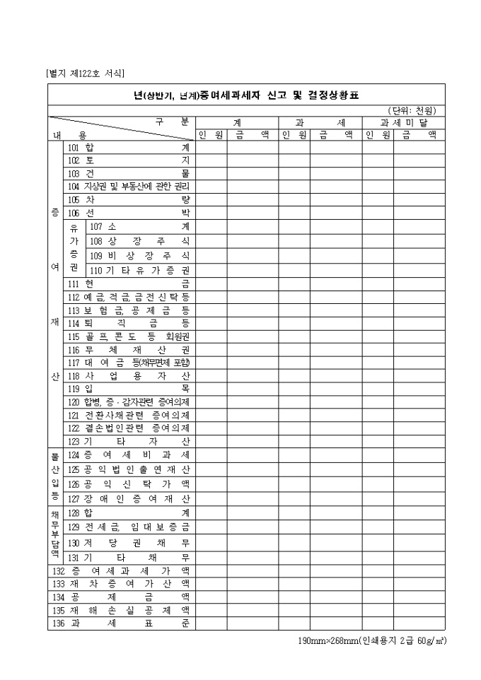9,000원/월제122호 증여세 과세자신고 및 결정상황표 양식입니다. 계, 과세, 과세미달 등을 기재합니다.