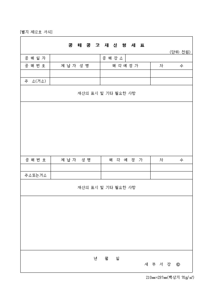 공매일자, 공매장소, 공매번호, 재산의표시 및 기타 필요한 사항 등을 기록하는 제12호 공매공고재산명세표 양식입니다.