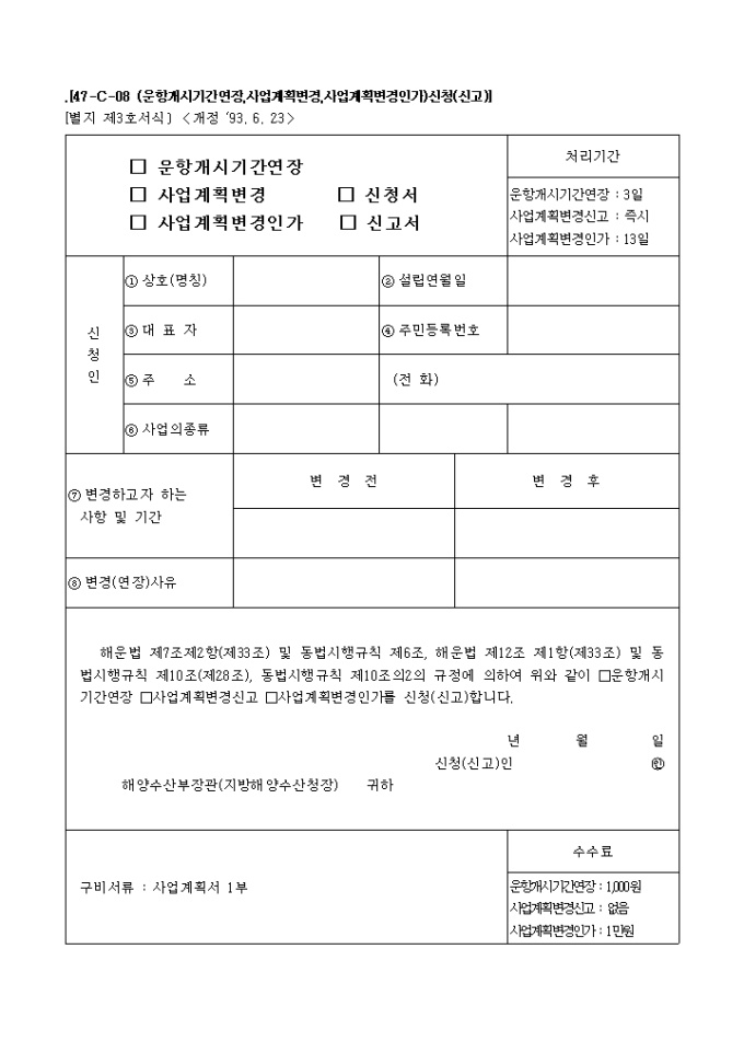 (운항개시기간연장, 사업계획변경, 사업계획변경인가, 신청서, 신고서)