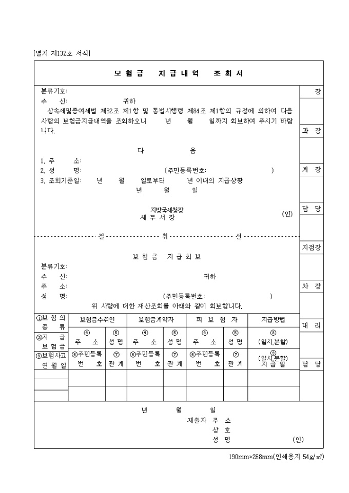 9,000원/월제132호 보험금 지급 내역 조회서 양식입니다. 상속세및증여세법 제82조 제1항 및 동법시행령 제84조 제1항의 규정에 의하여 다음 사람의 보험금지급내역을 조회하오니 년 월 일까지 회보하여 주시기 바랍니다.