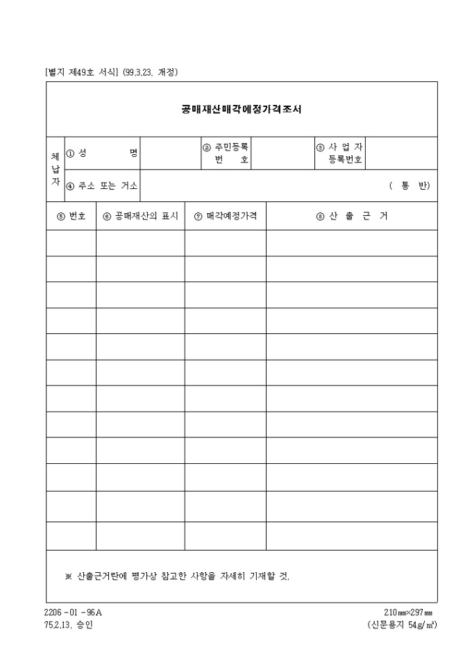 제49호 공매재산매각예정가격조서(1999.3.23. 개정)