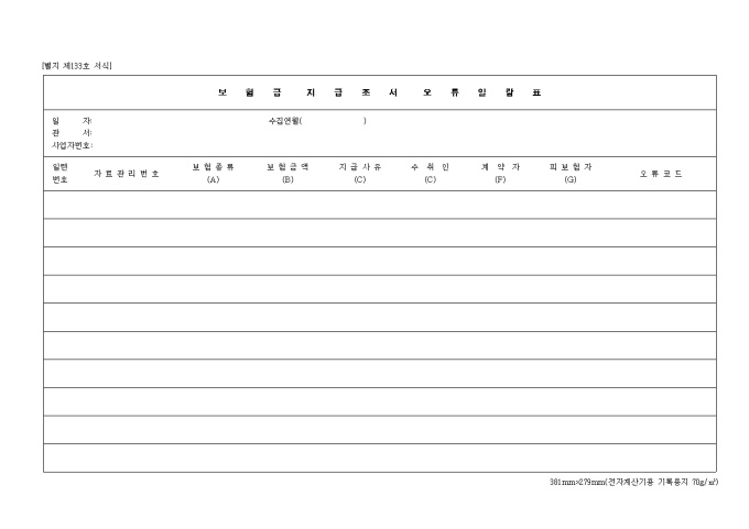 9,000원/월제133호 보험금 지급 조서 오류 일람표 양식입니다. 일련번호, 자료관리 번호, 보험종류, 보험금액, 지급사유, 수취인, 계약자, 피보험자, 오류 코드 등을 기재합니다.